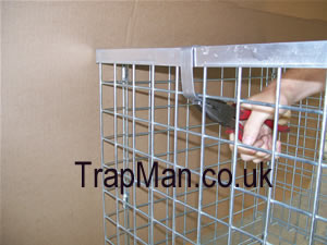Flat pack fox trap only, lift the panel's and temporarily make the cage to size, turn the cage so that it stands vertically on the open end, position the end panel and locate the five fixing tabs, fold these tabs and locate them in a mesh hole approximately one square from the end of the cage, fold the end of the tab through the hole, bend and pull it with a pair of pliers, fix the others in the same way ensuring the trap remains "square"